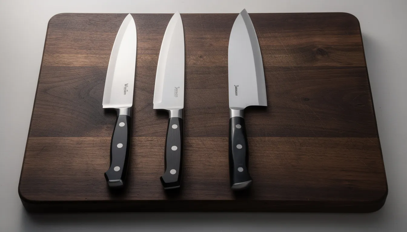 Western chef knives are generally heavier, thicker, and commonly use softer stainless steel that’s less prone to chipping. Japanese-style chef knives are often lighter with thinner, more precise blades, and frequently use harder high-carbon steel for sharper edges. Western profiles are usually more curved for rocking, while many Japanese designs favor straighter edges for push-cutting and cleaner slicing.